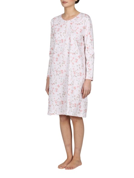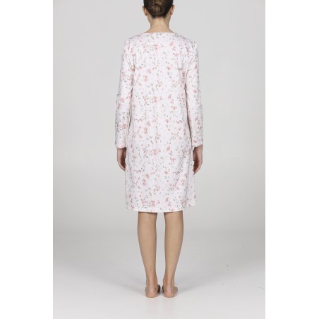 Camicia da notte in caldo interlock 36/1 di puro cotone. Modello serafino con bottoncini, lunghezza cm.95. Tessuto stampato con raffinato disegno a fiorellini. Ricercatezza, stile e qualità a marchio Boglietti.