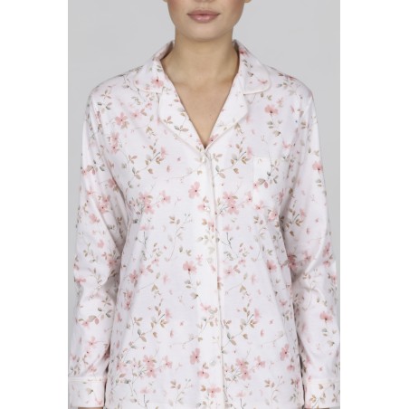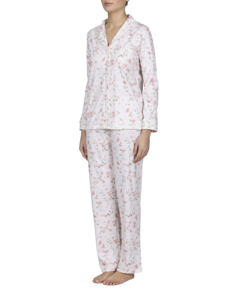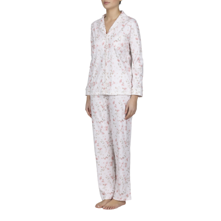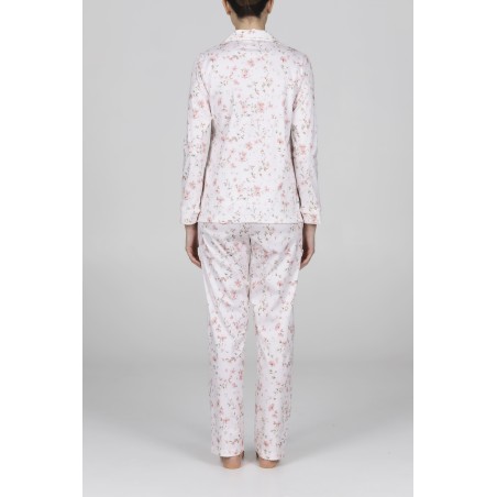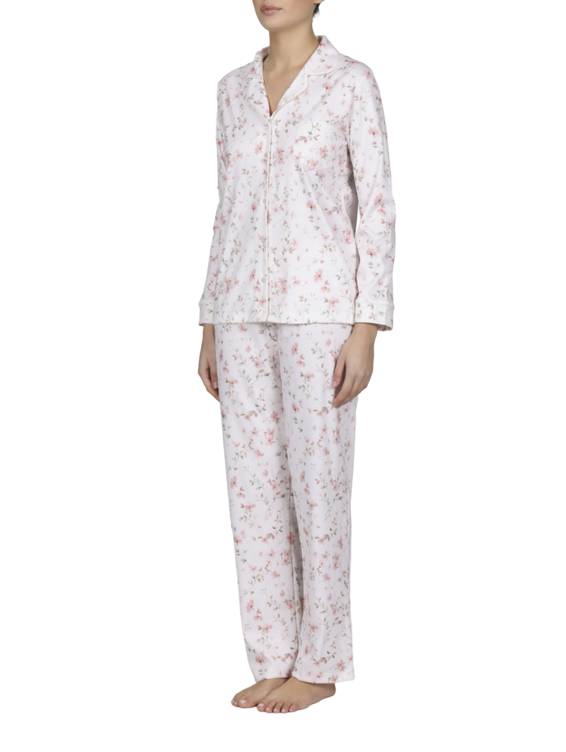 Pigiama lungo donna in caldo interlock 36/1 di puro cotone. Giacca modello cardigan con colletto e revers. Tessuto stampato con disegno fiorellini. Ricercatezza, stile e qualità a marchio Boglietti.
