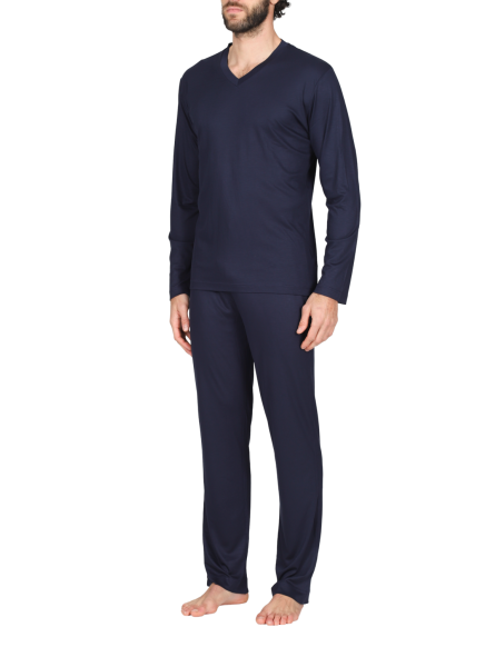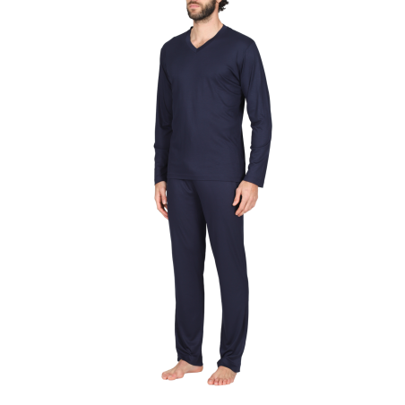 Pigiama uomo collo a V, in finissimo interlock di lyocell in tinta unita: fibra derivata dalla cellulosa naturale, fa parte della famiglia delle viscose ed è la più preziosa. Eccezionale traspirabilità. Invidiabile comfort dato dalla scivolosità, dalla morbidezza e dall’elasticità di una delle fibre più ecosostenibili.