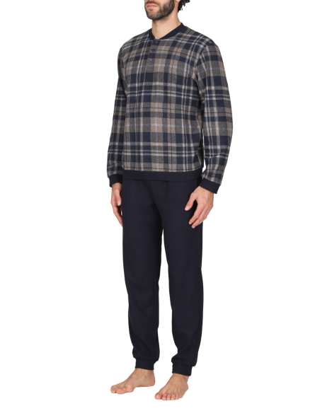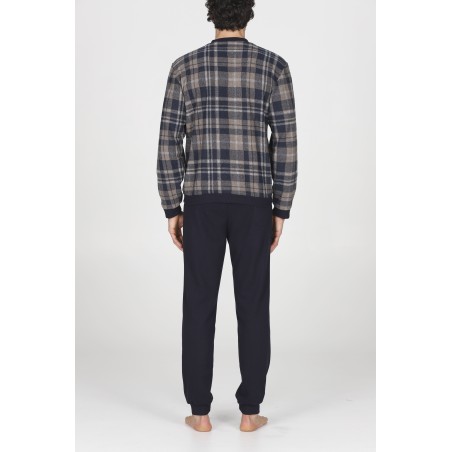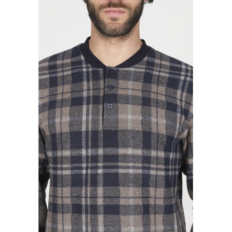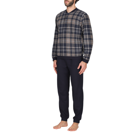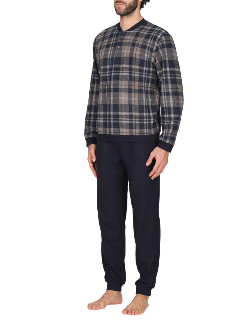 Pigiama serafino uomo, in jacquard EcoLife di misto cotone: caldo, elegante e pratico è adatto sia per la notte che al vestire in casa per un massimo comfort. Maglia con disegno scozzese blu e pantalone in tinta unita. Con polsini. Per realizzare i nostri Jacquad abbiamo utilizzato il 50% di cotone e il 50% di tessuti Ecosostenibili scelti in base a criteri di basso impatto ambientale; come l'utilizzo di fibre prodotte grazie a energie rinnovabili e riciclo dell'acqua. Un'alternativa per un futuro più verde.